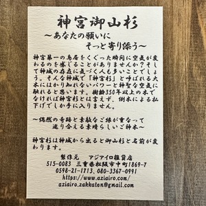 神宮第一の鳥居をくぐった瞬間に空気が変わるのを感じる事はありませんか?そして、神域の存在に気づく人も多い事でしょう。そんな神域で「神宮杉」と呼ばれる大木に計り知れないパワーと神聖な空気にふれると思います。樹齢350年以上の木でなければ神宮杉と言えず、倒木による払い下げでしか手に入りません。