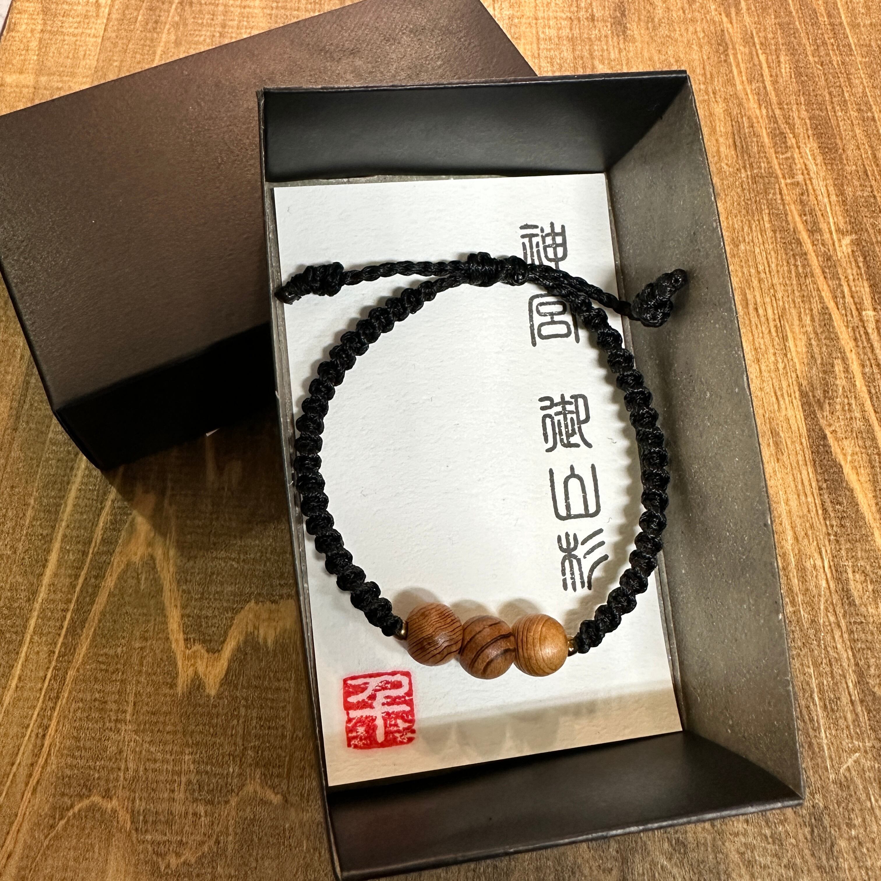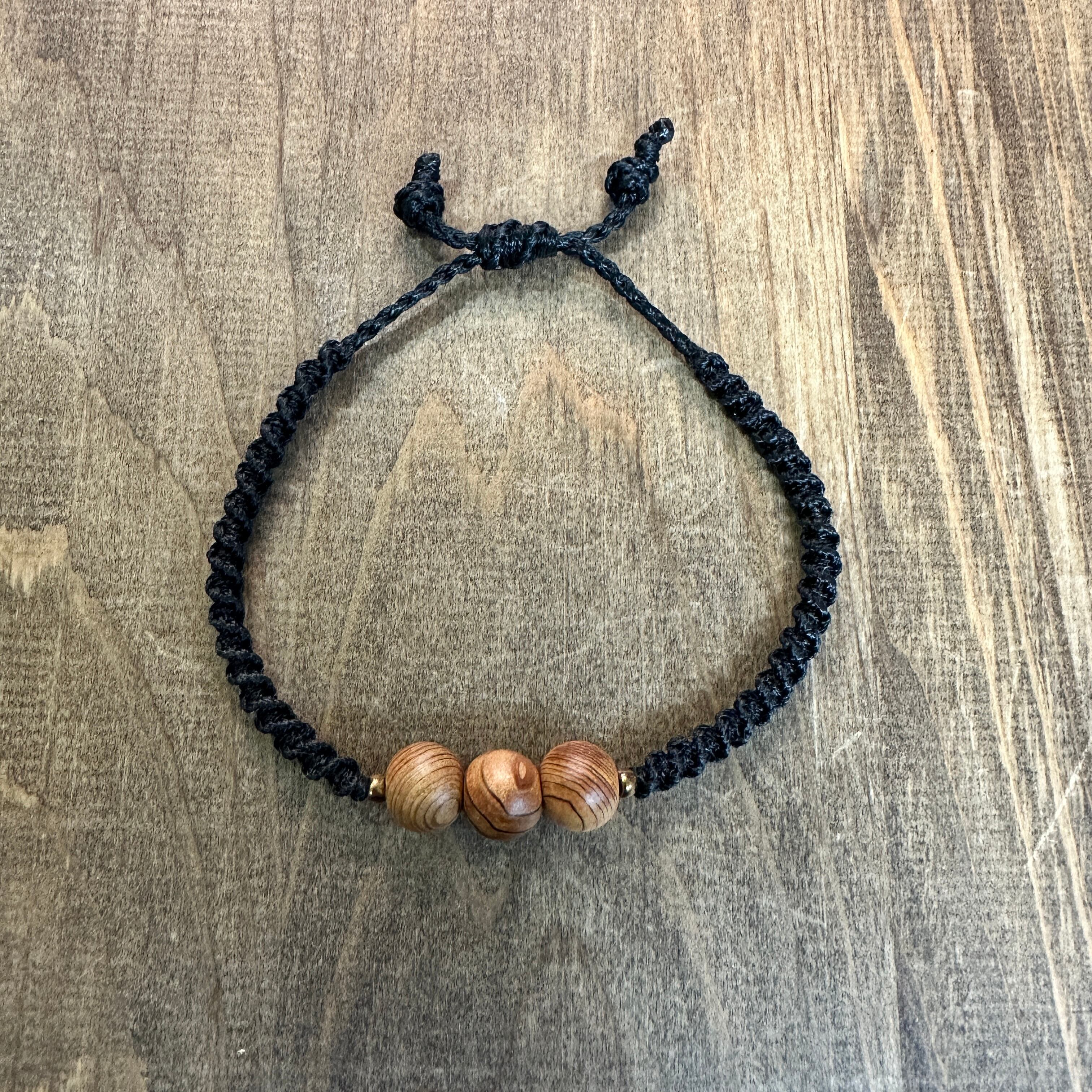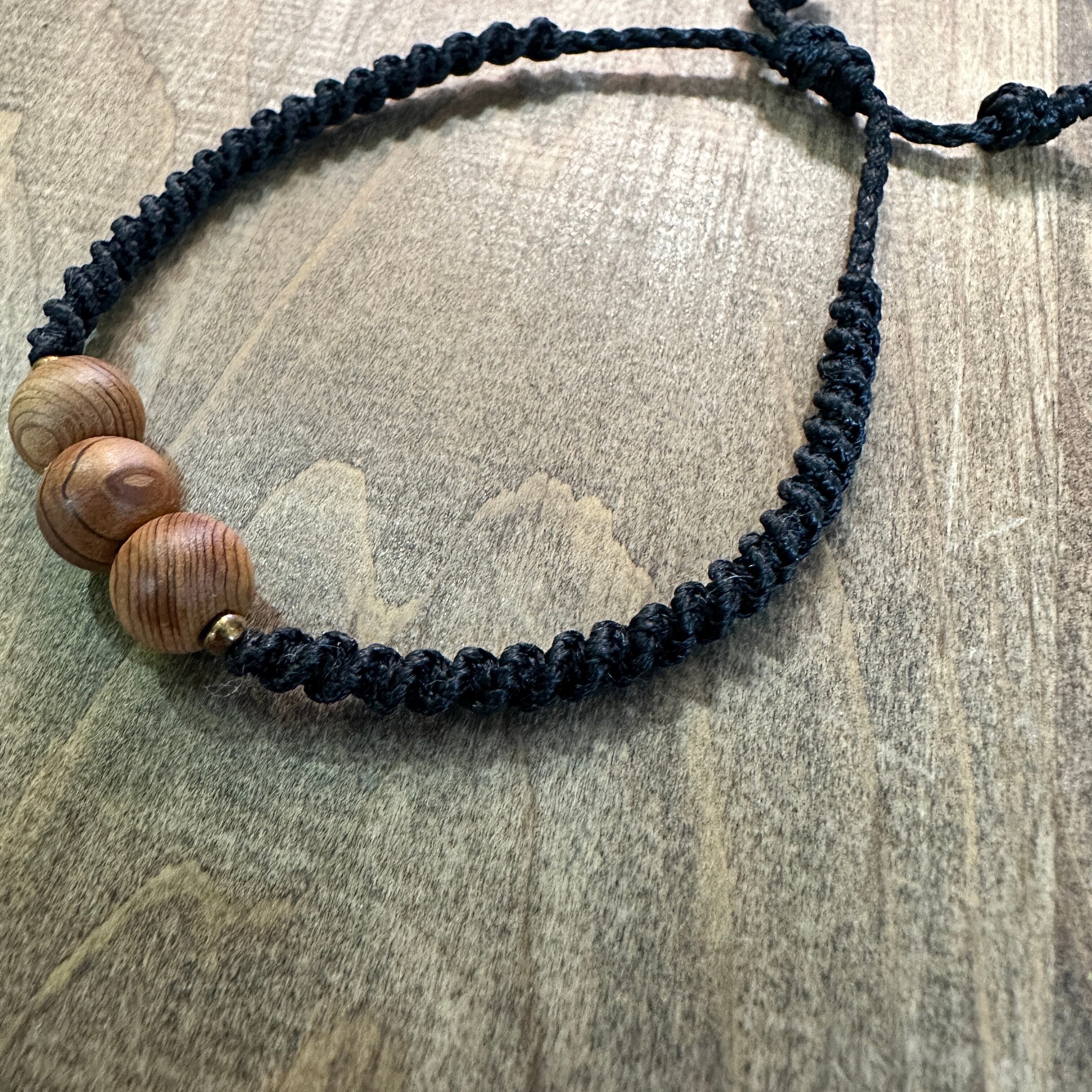 神宮御山杉8mm玉を使用したブレスレットです。アジアイロらしく、両サイドにはゴールドのビーズを配置しました。コットンコードをねじり編みし、アクセントをつけ気軽に身につけていただけるアイテムです。