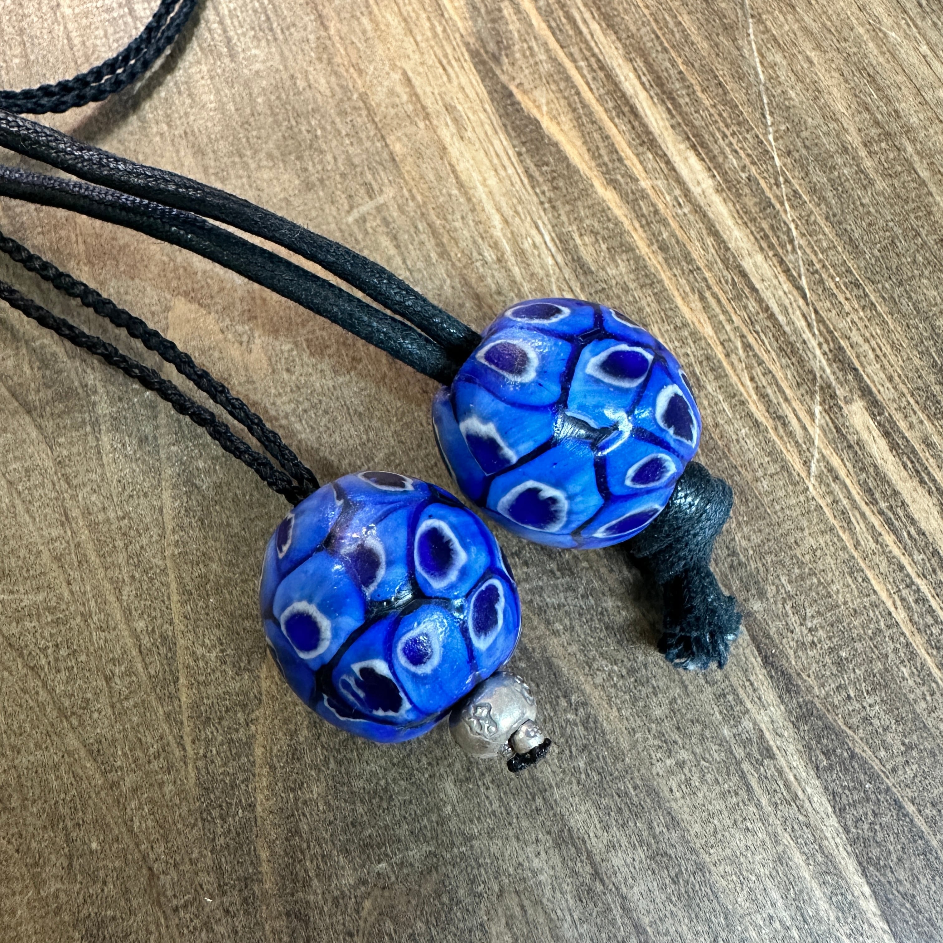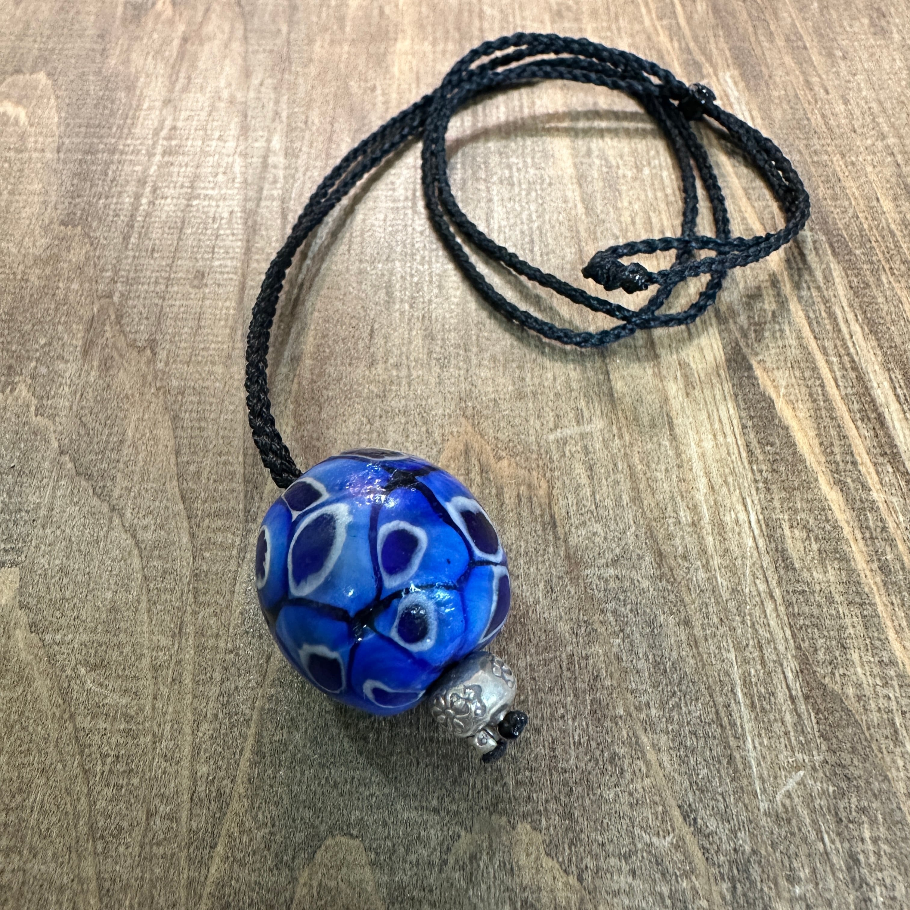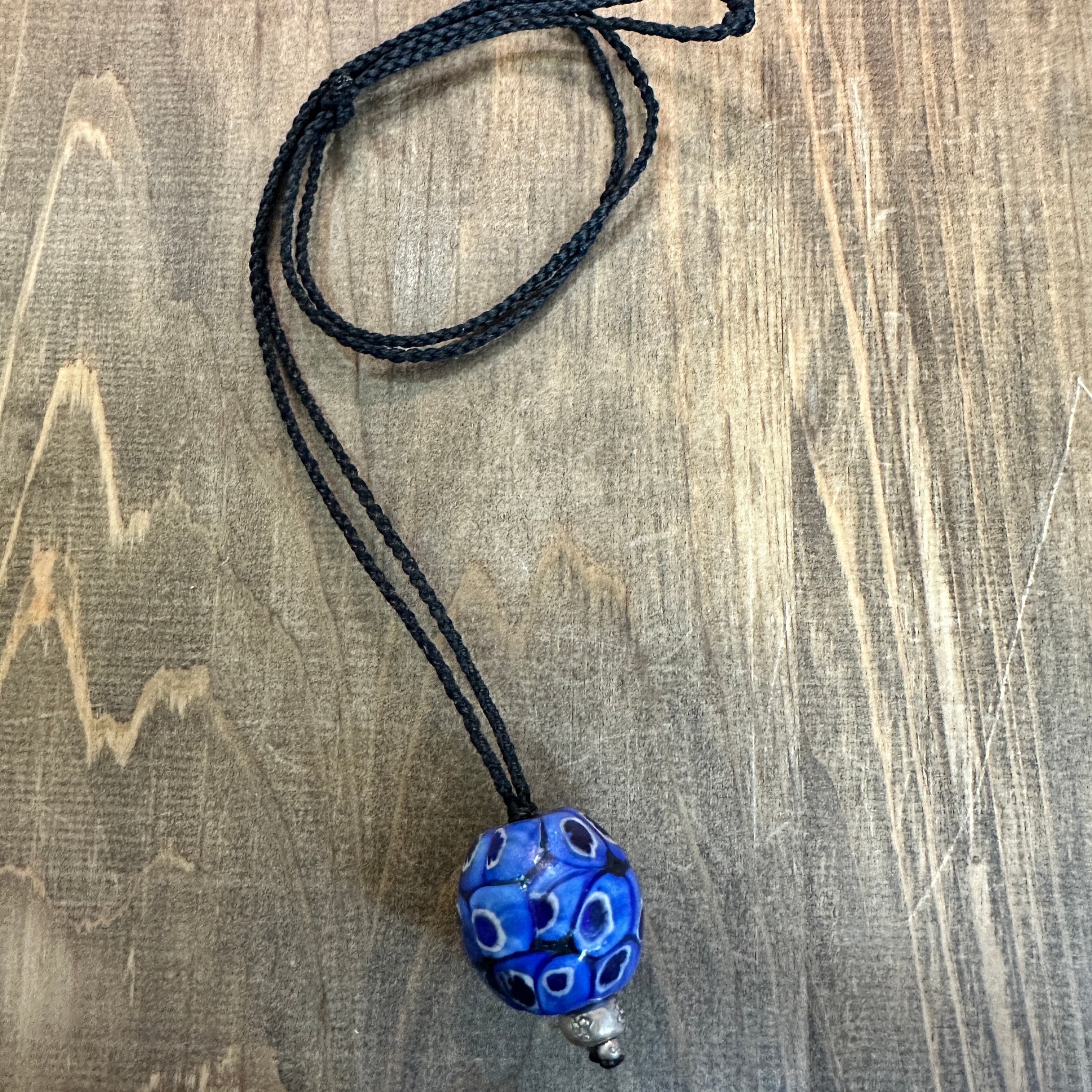 店主がマレーシアで買い付けたウル族ビーズ。ブルーが鮮やかな約3cmの大玉ビーズにカレンシルバーを組み合わせました。一つで存在感のある大人ビーズネックレスに仕上げました。