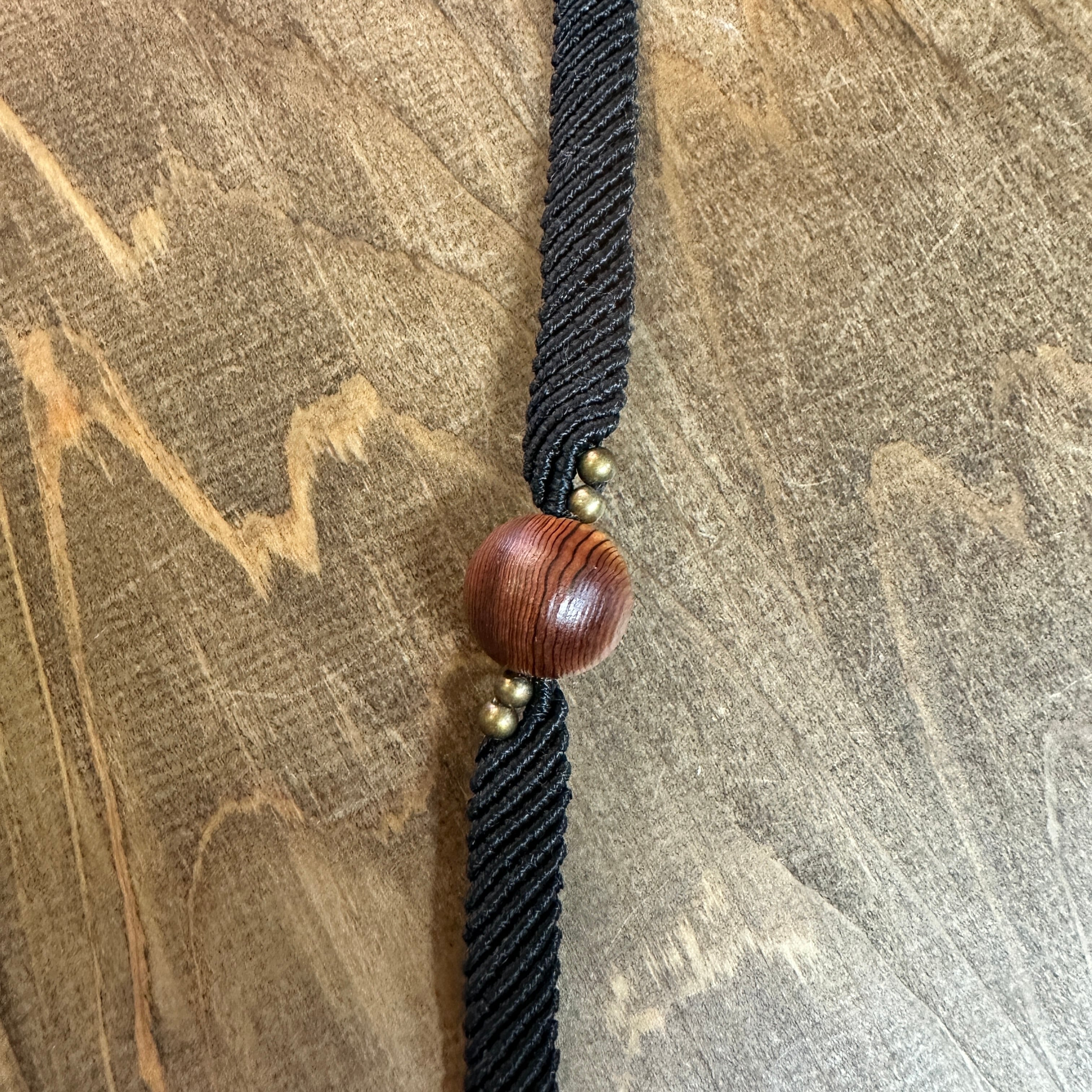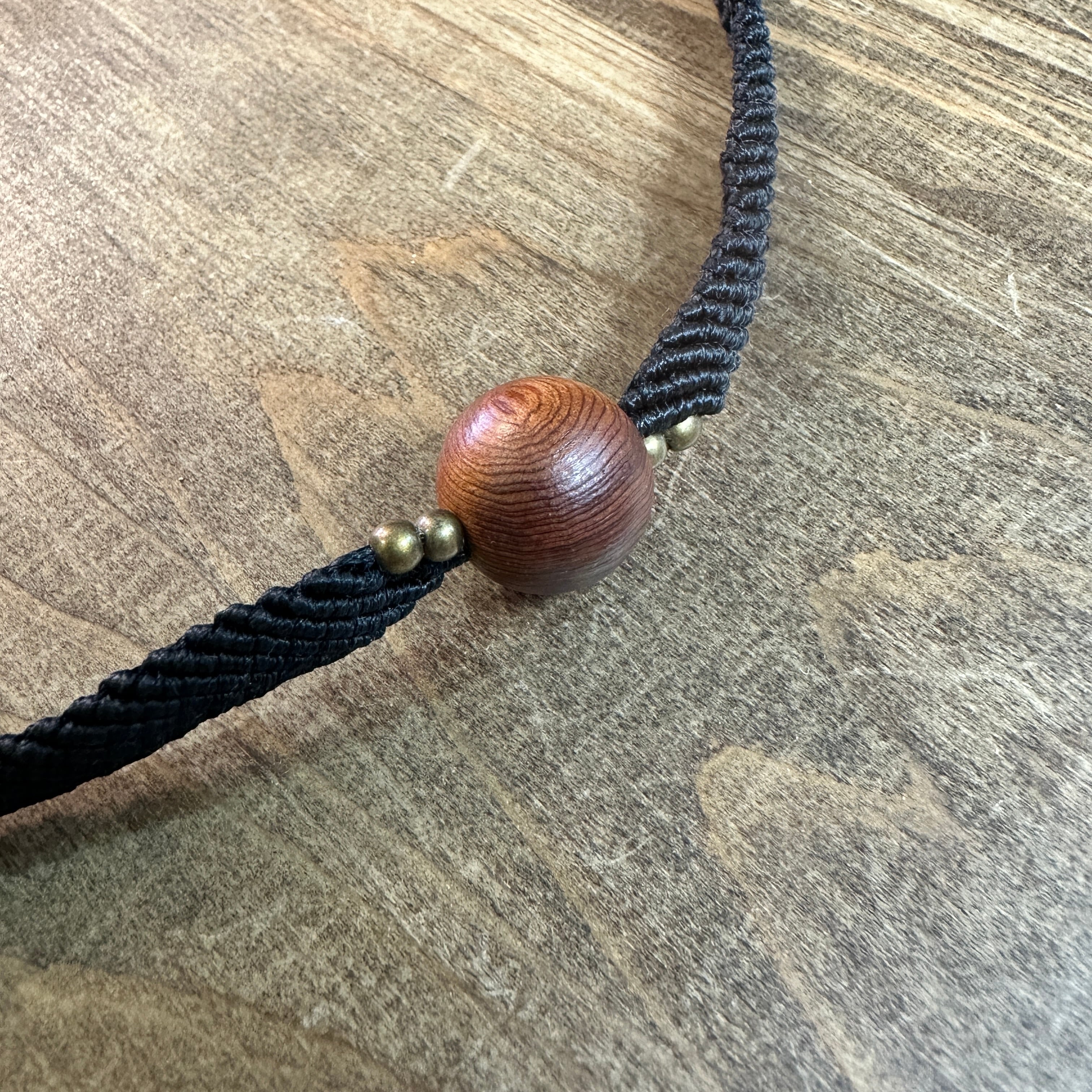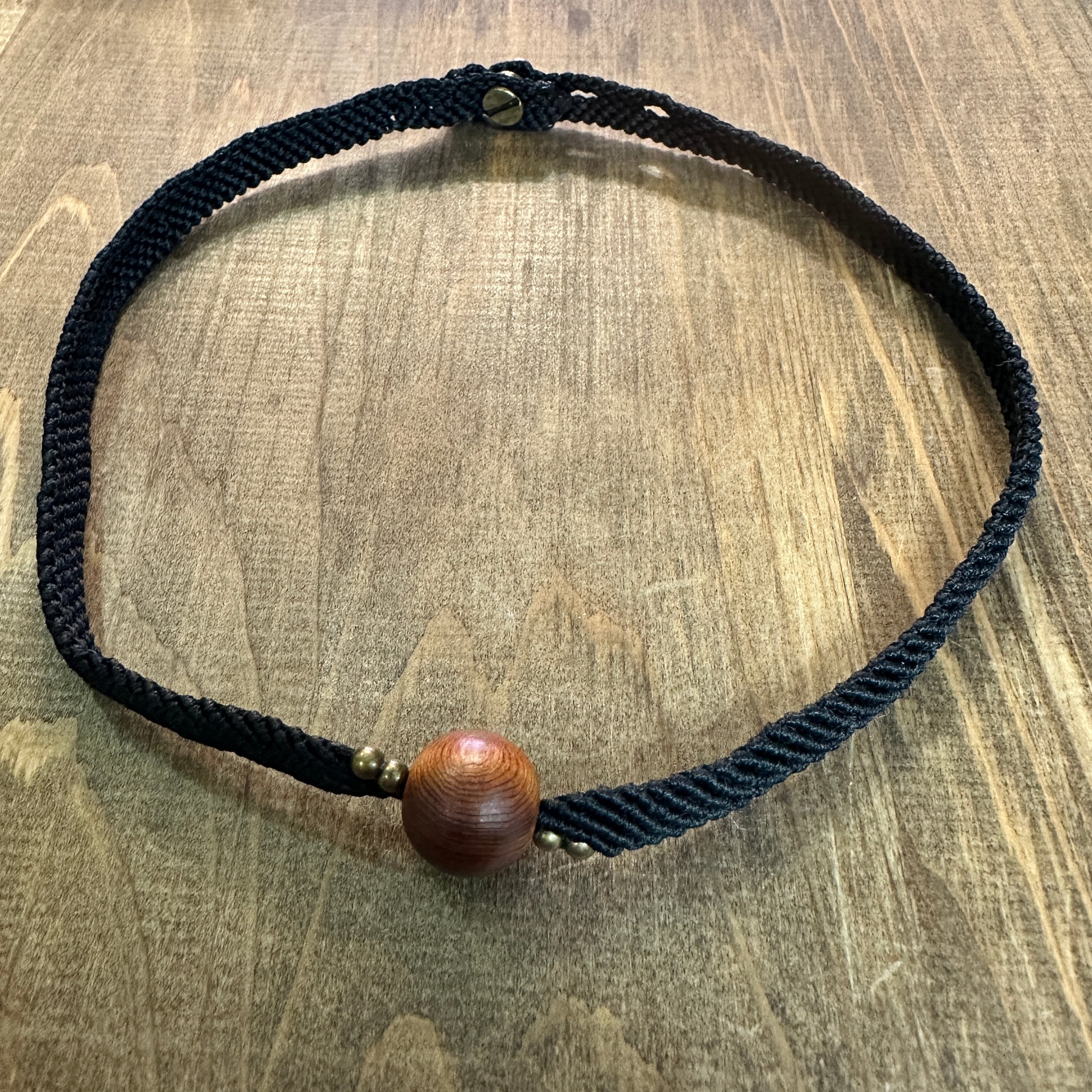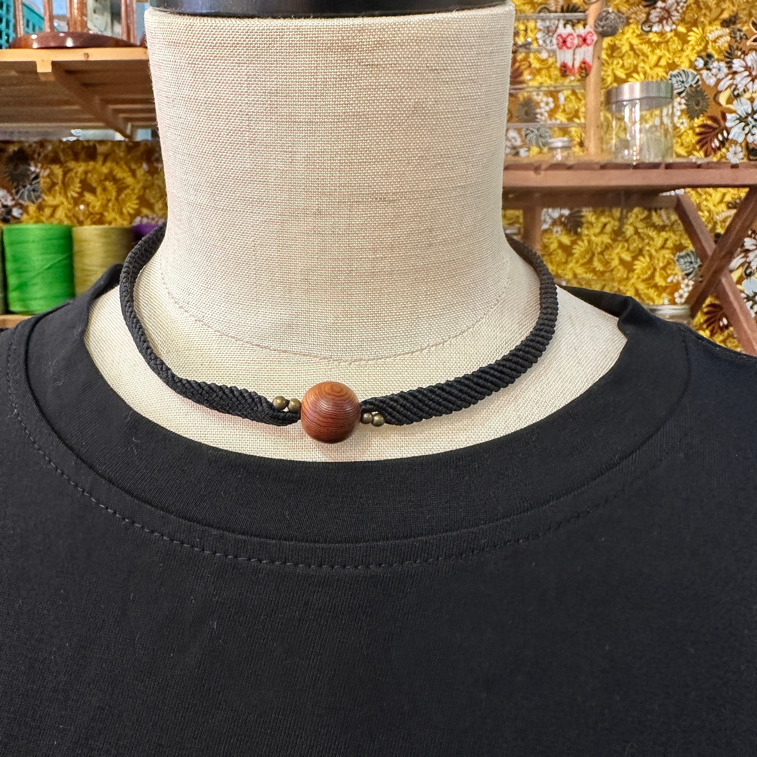 神宮御山杉16mm玉をマクラメ編みで丁寧に編みこんだチョーカーです。アクセントに真鍮ビーズを合わせ黒を基調にキリッと仕上げました。首元にピタリと肌馴染みのよいコットンコードを使用してます。