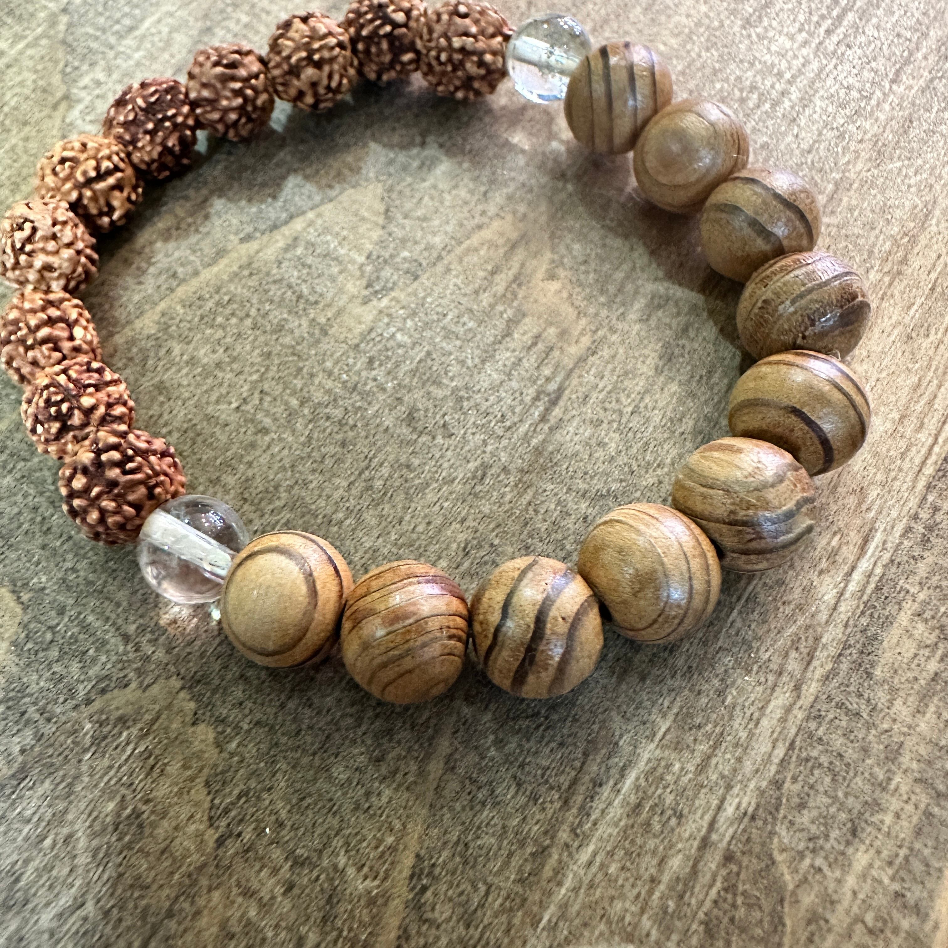 神宮御山杉8mm玉と菩提樹の実、水晶を組み合わせたシンプルな異素材ブレスレットです。菩提樹の実は浄化や魔除けの効果があるとされています。一粒一粒の表情が異なり経年変化をお楽しみいただけます。