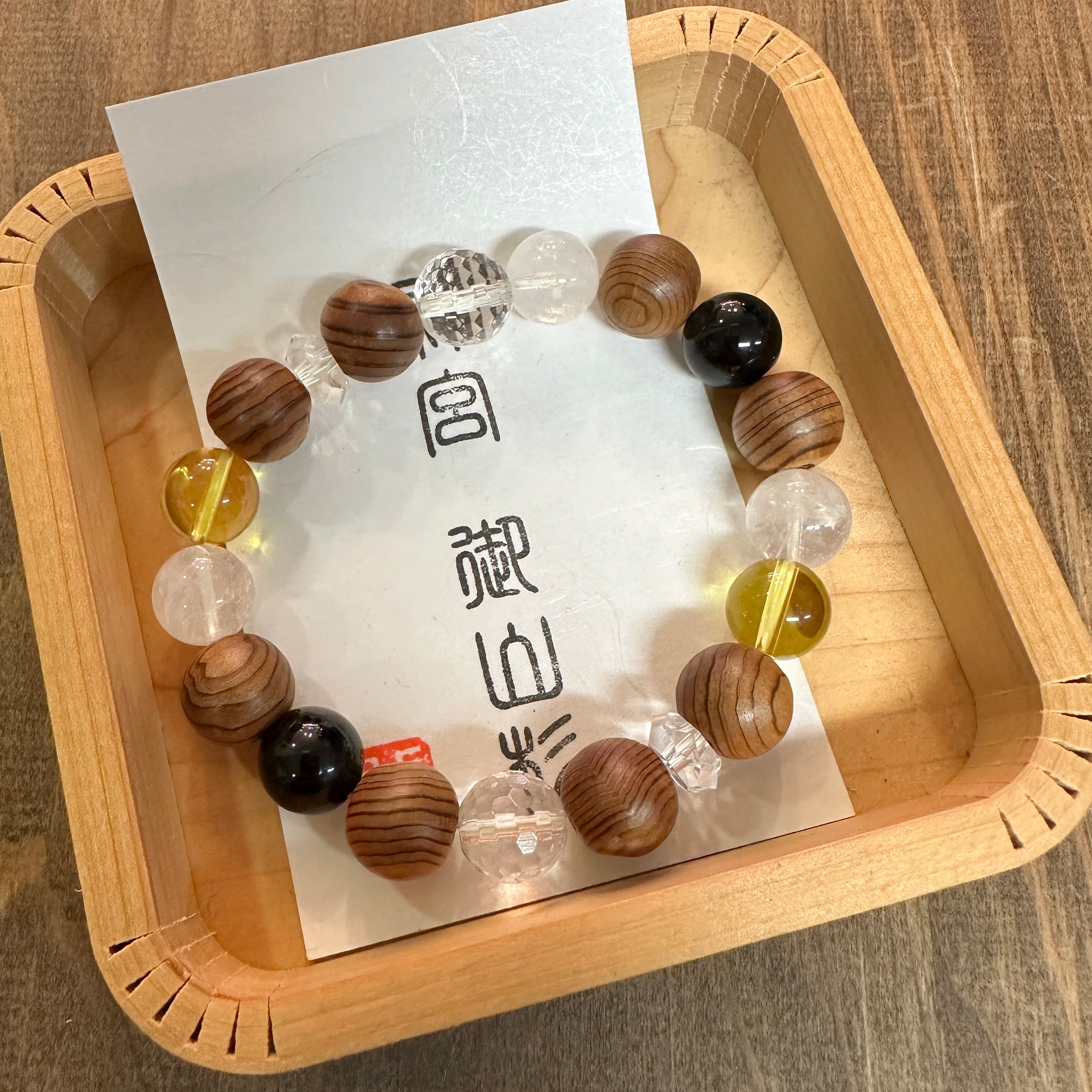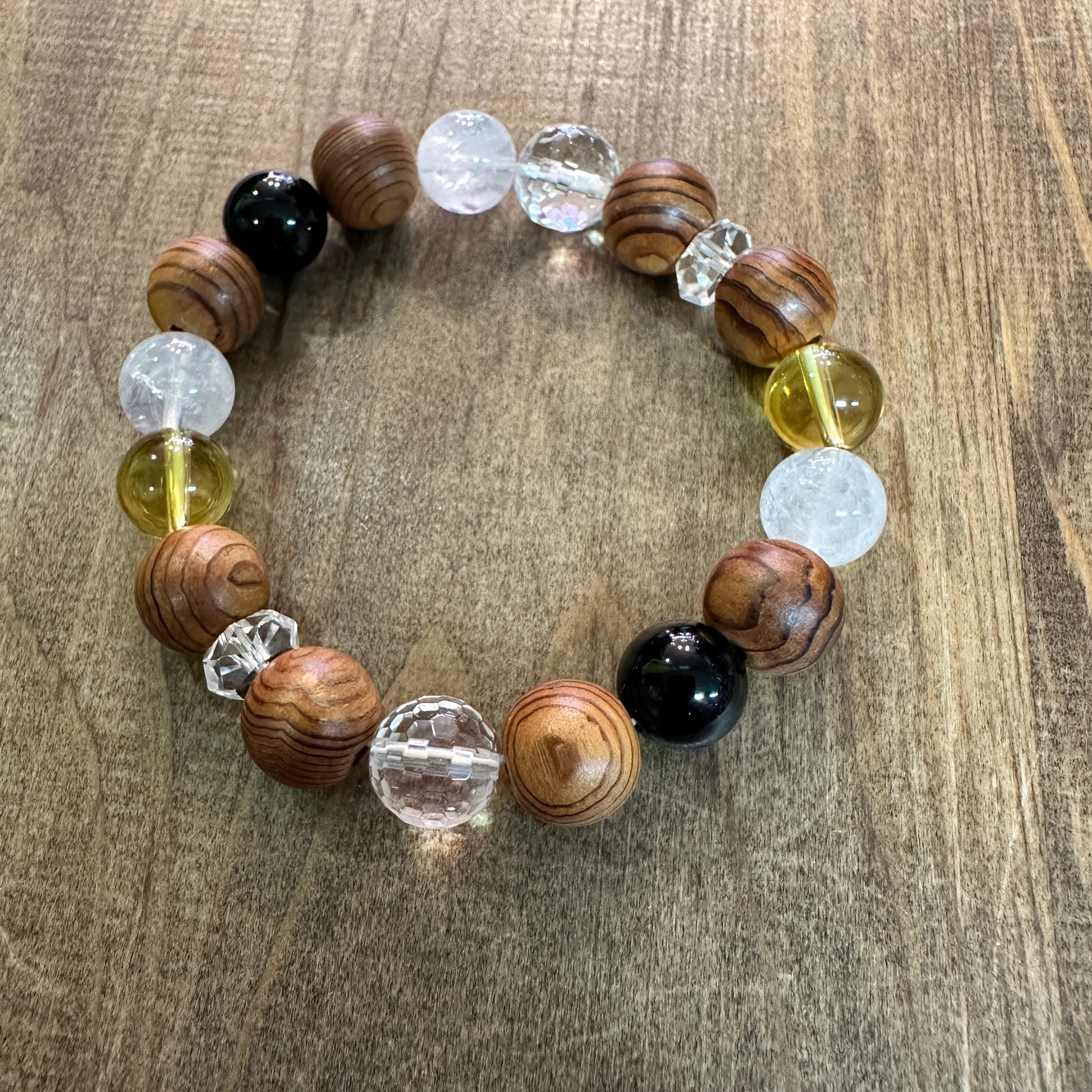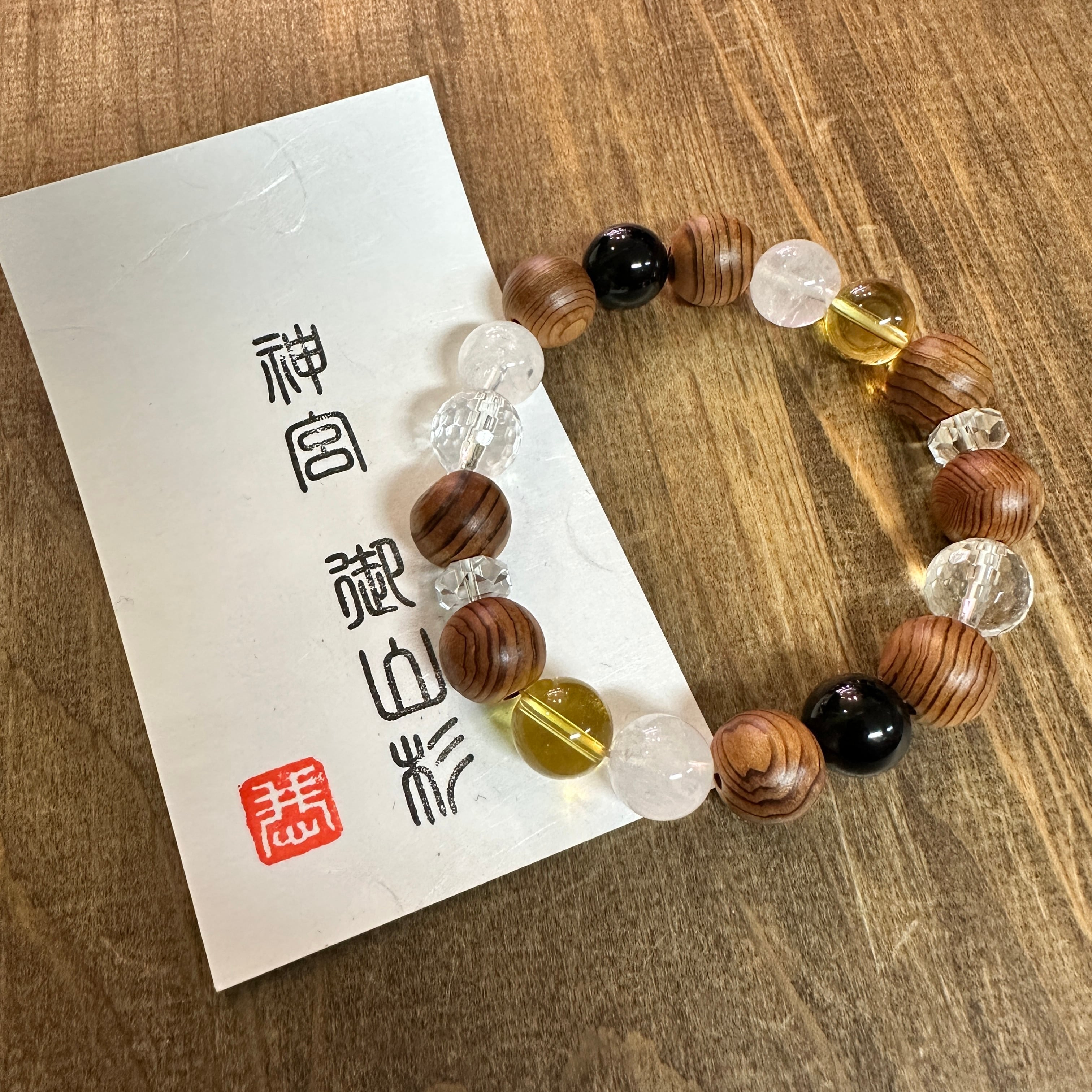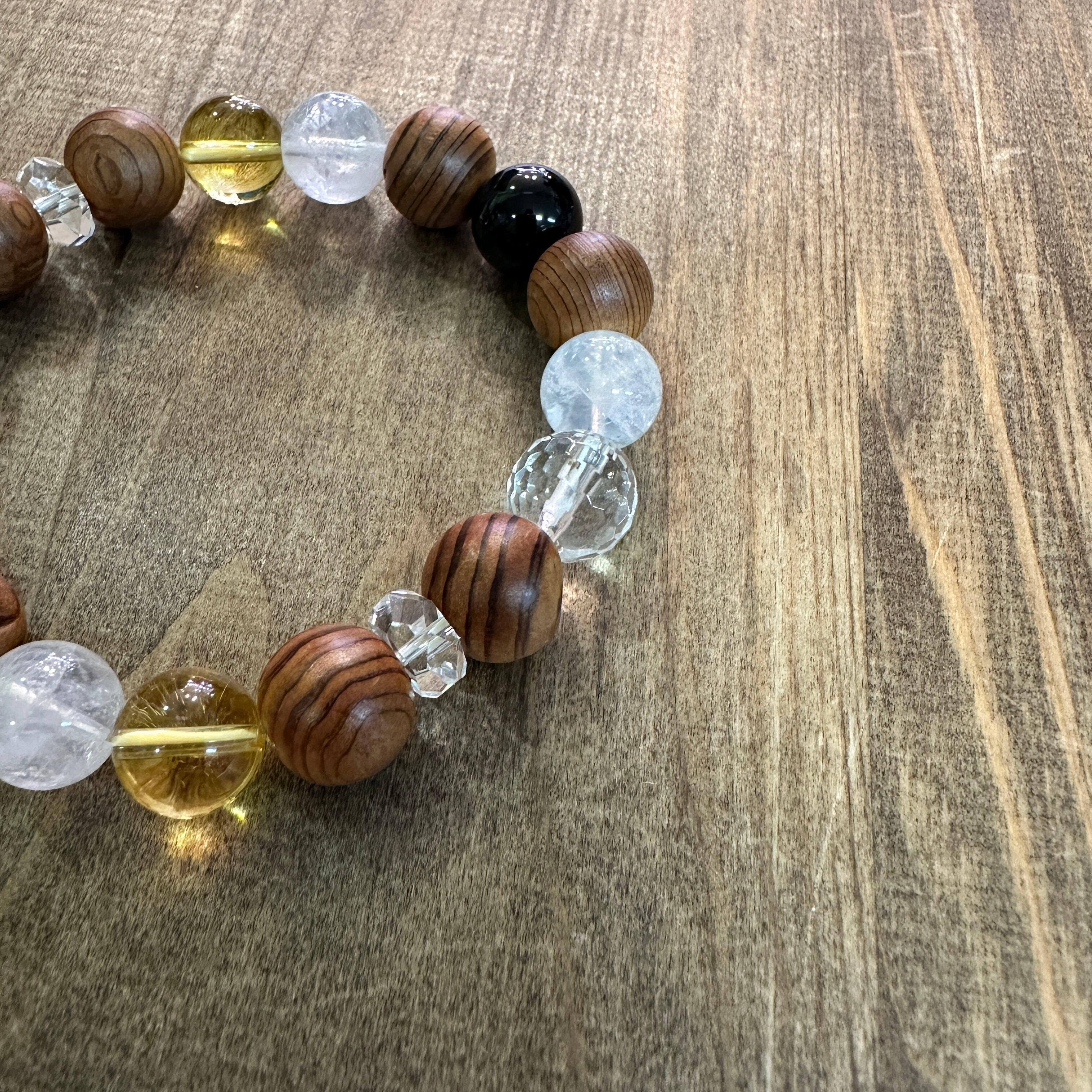 神宮御山杉10mm玉と天然石を組み合わせたブレスレットです。天然石は水晶、ヒマラヤ水晶、シトリン、モリオンそれぞれに効果や意味を持ち合わせています。御山杉は一粒一粒の表情が異なり経年変化をお楽しみいただけます。