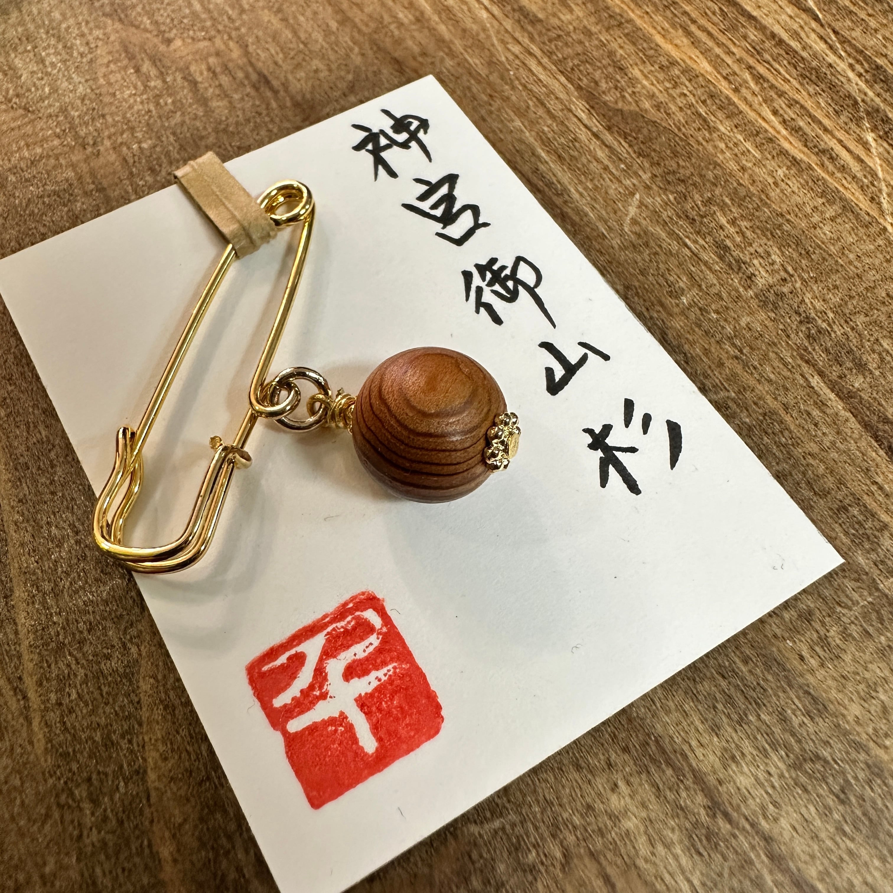 神宮御山杉10mm玉を使用したシンプルなブローチです。一つ一つ色や木目の出方が異なります。アクセサリーは苦手な方にオススメのアイテムです。